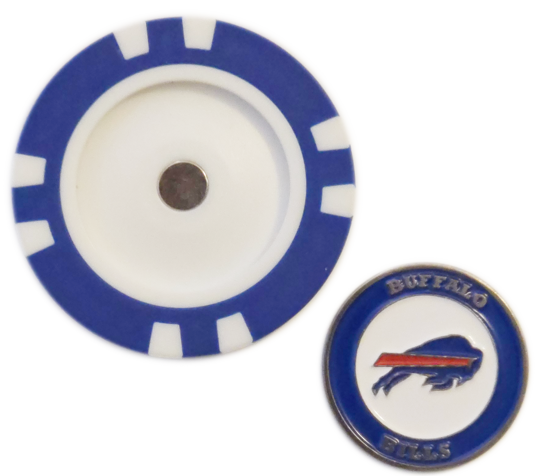 Celebrate the Buffalo Bills with this officially licensed poker chip ball marker. Designed in classic Bills colors and featuring the iconic charging buffalo logo, this marker brings Buffalo pride to every round. The poker chip includes a removable, magnetic metal marker that snaps into place, making it a convenient and stylish way to mark your ball on the course.