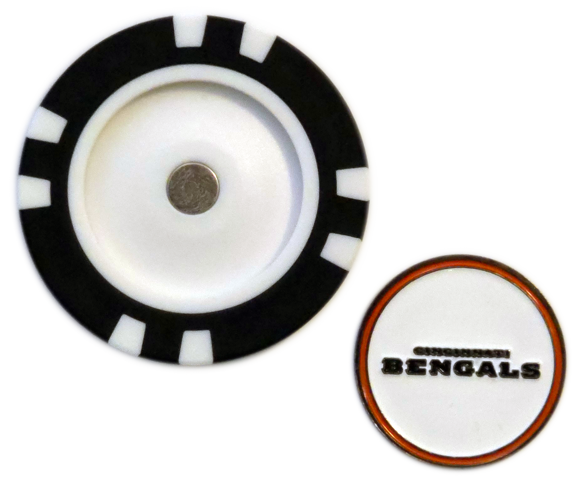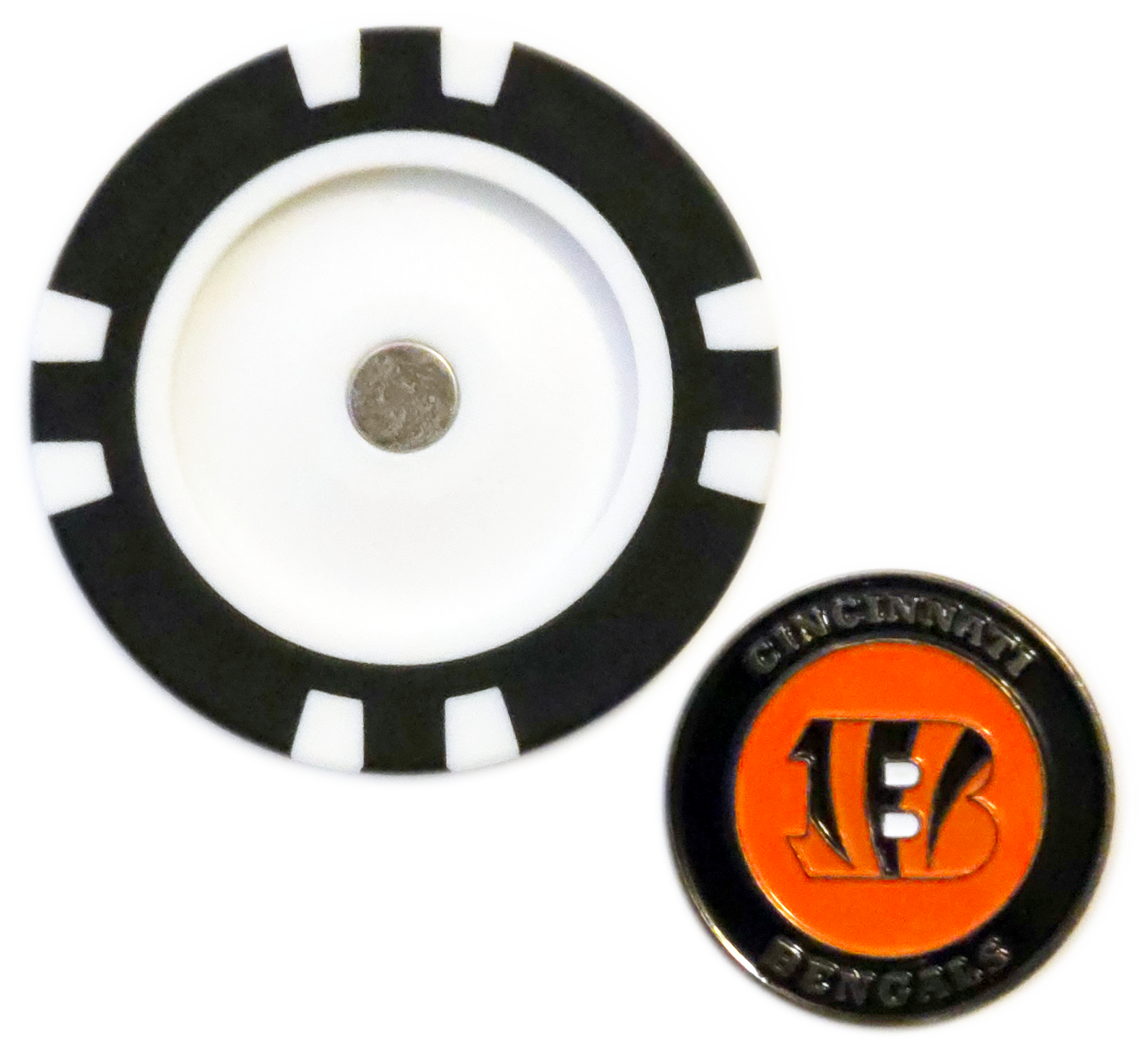 This officially licensed Cincinnati Bengals Poker Chip Ball Marker is perfect for Bengals fans, letting you mark your ball with team spirit. The poker chip features a removable, double-sided metal marker that snaps into place magnetically. Designed in iconic Bengals orange, black, and white, and featuring the fierce “B” logo, this marker brings Bengals energy to the golf course.