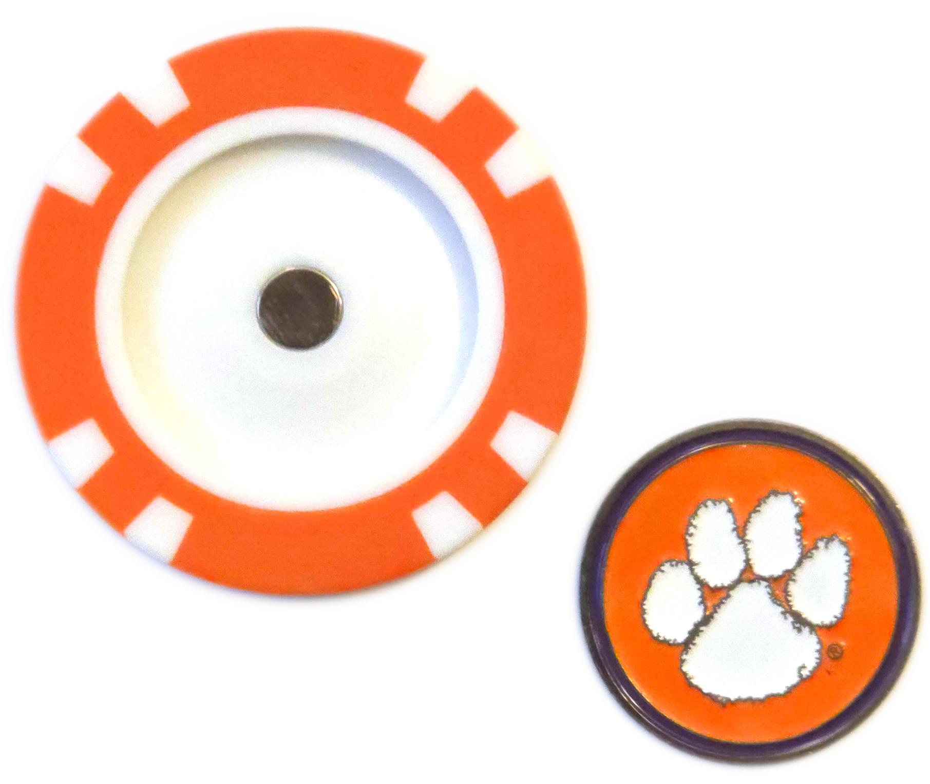 Rep Clemson University with this officially licensed poker chip ball marker. The poker chip includes a removable, double-sided metal marker that magnetically snaps into place, making it convenient for marking your ball while flaunting Clemson’s classic orange and purple colors and paw print logo. It’s the ultimate golf accessory for any Clemson Tiger fan.