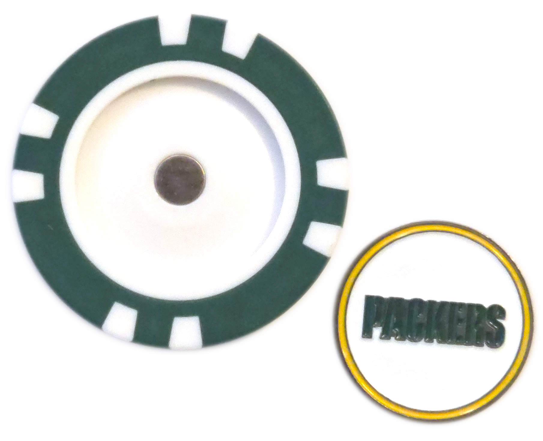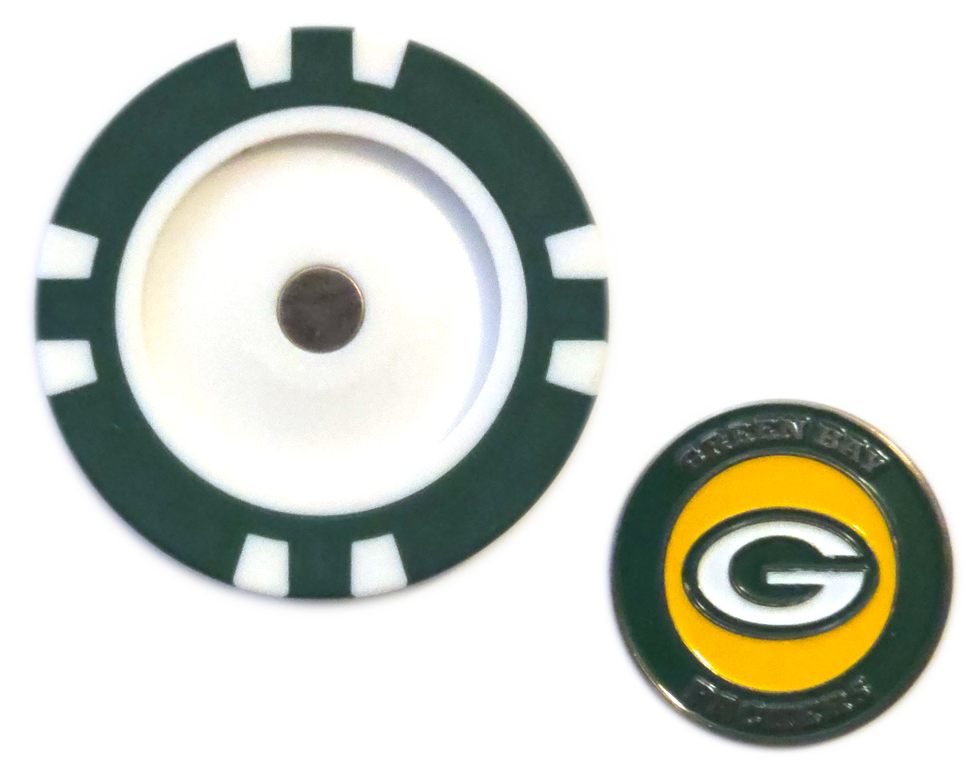 For Packers fans, this officially licensed Green Bay Packers Poker Chip Ball Marker is a must-have. The poker chip includes a removable, double-sided metal marker that snaps magnetically into place, making it quick and easy to mark your ball. With classic green, gold, and white colors and the iconic "G" logo, this marker keeps your Packers pride front and center on every green.